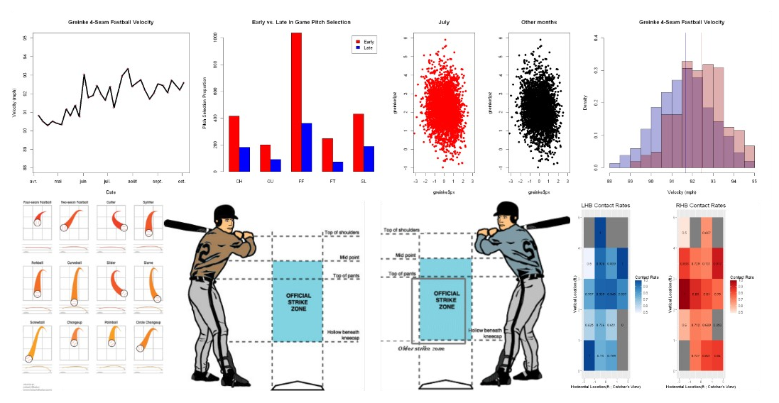 Topics: multivariate analysis and visual exploration. Clean and format datasets. Pitching velocity, mix, patterns, location in the ball-strike zone. Change by month, by game, by inning. Ball-strike count, early- and late-game situations. Velocity, impact, and contact rate.
