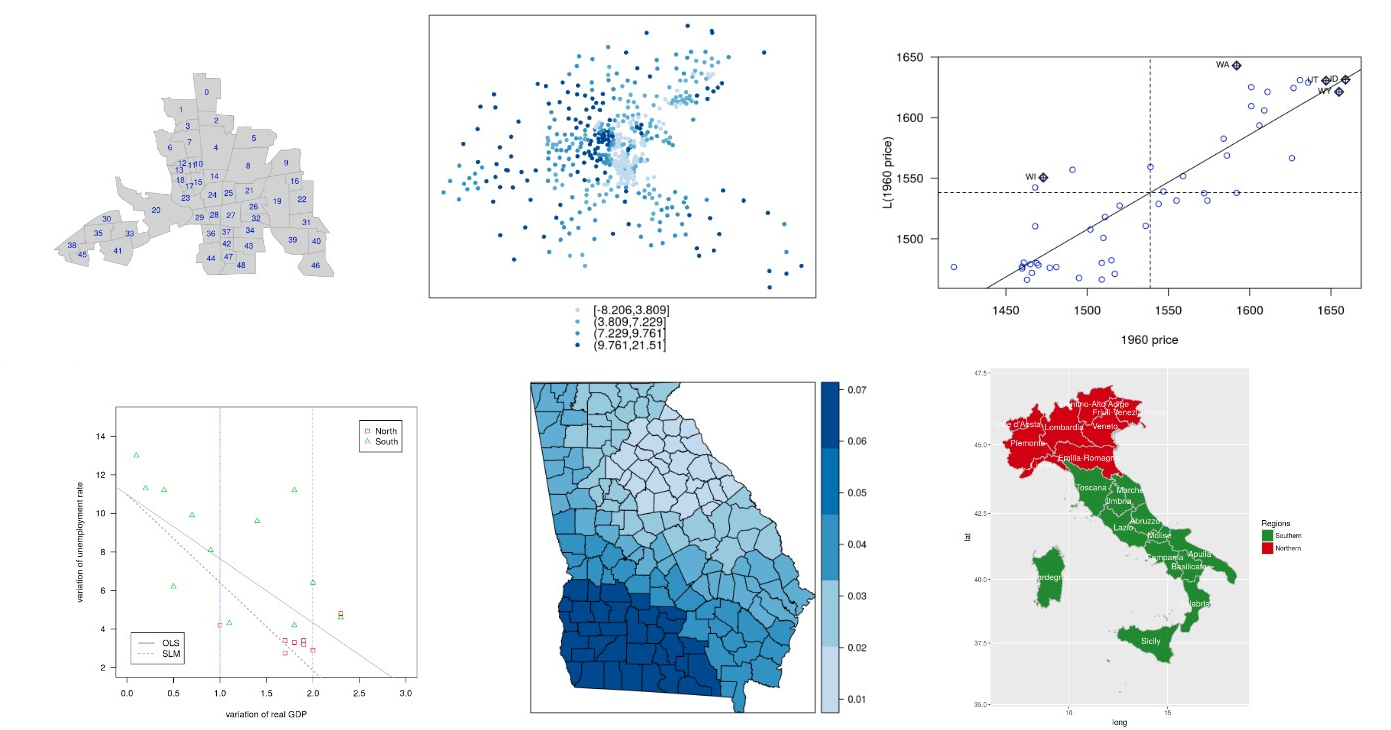 Consult the cases in a new tab (Show/Hide All Code in the case upper-right corner) and the notes in a new tab (Show/Hide All Code in the case upper-right corner). The notes review the book A Primer for Spatial Econometrics from which the cases are taken from. We can also find a book review (GIS, R, Python).