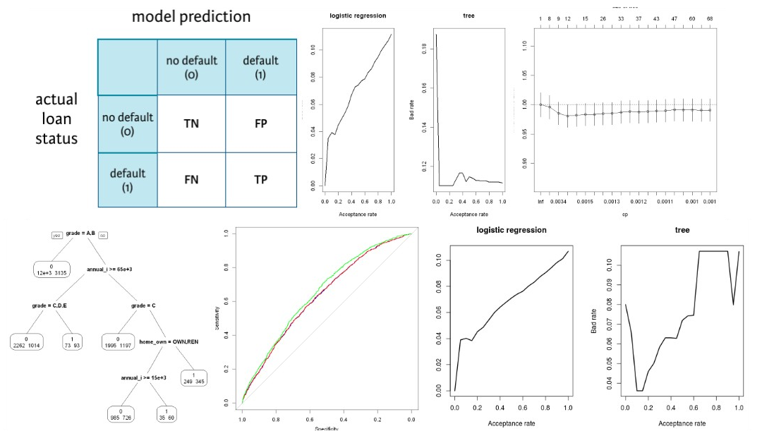 Topics: logit, probit, loglog and decision trees. Descriptive statistics. Train and test sets. Predictions. Confusion Matrix and ROC. Bank loan portfolio acceptance rate, bad rate, and risk tolerance.